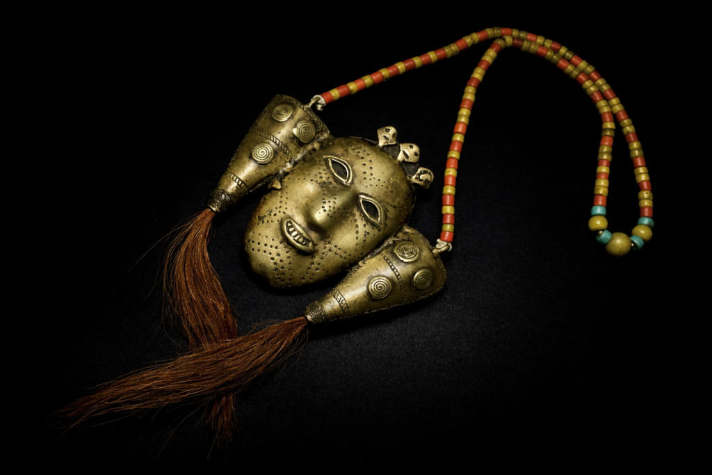 顔型のネックレスの中でも非常に珍しい意匠のネックレス。動物の毛もあしらわれており、個性が際立つ逸品です。