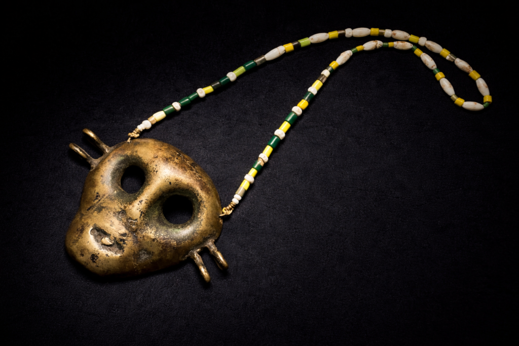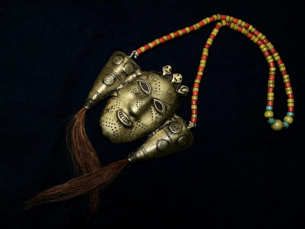 顔型のネックレスの中でも非常に珍しい意匠のネックレス。動物の毛もあしらわれており、個性が際立つ逸品です。