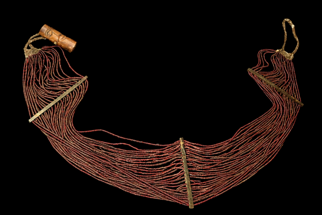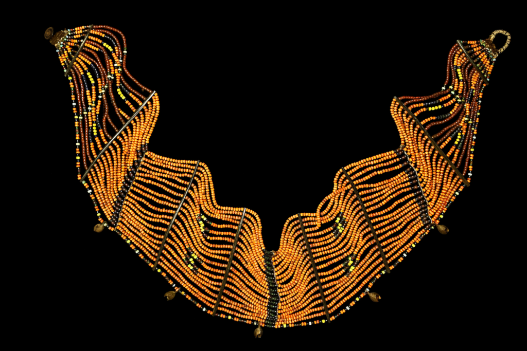 止めの部分が個性的な胸全体を覆う形のネックレス。細かなビーズを大量に使用したオリジナルの逸品です。