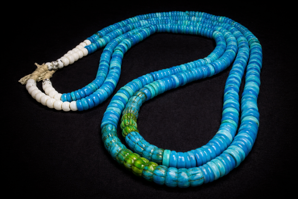 2本揃いのナガ族オリジナルネックレス。鮮やかなブルーと中央のいくつかに時代を感じさせてくれる跡が残っています。