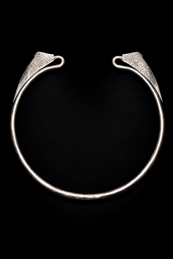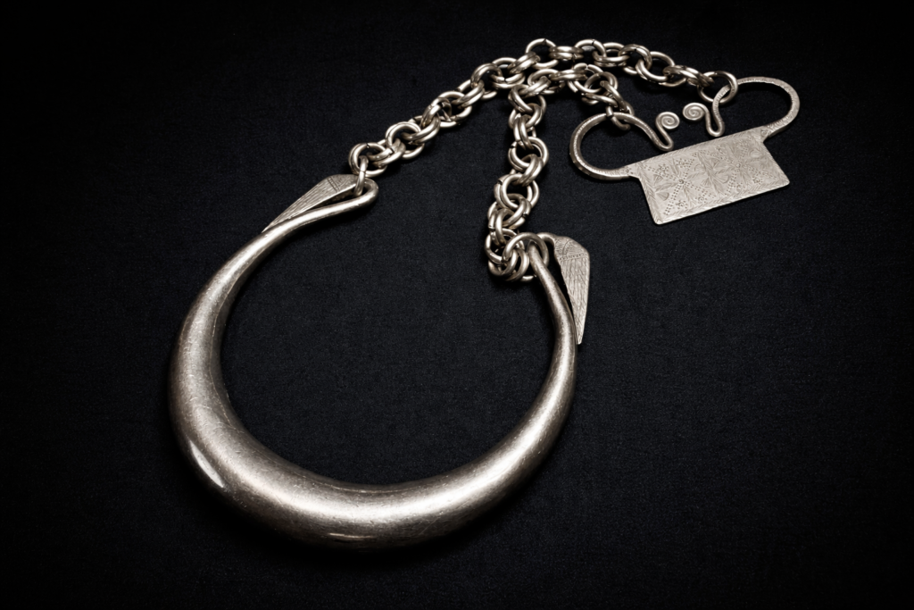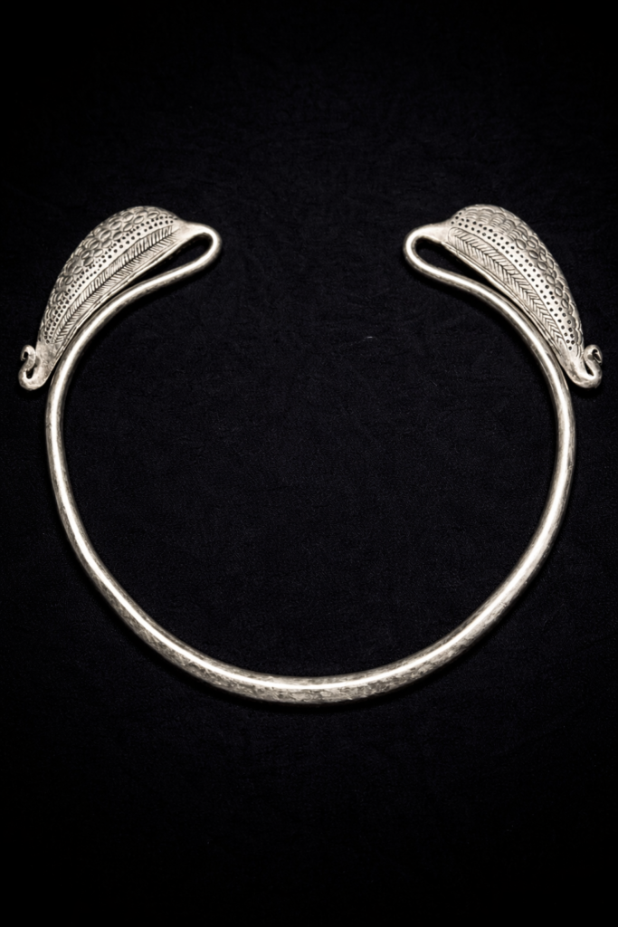 モン族が実際に使用してきたオリジナルのシルバーネックリング。鋭い羽のようにも見えますし鳥さんの嘴にも見えます。しっかりと重さがあり状態も申し分ない貴重な逸品。