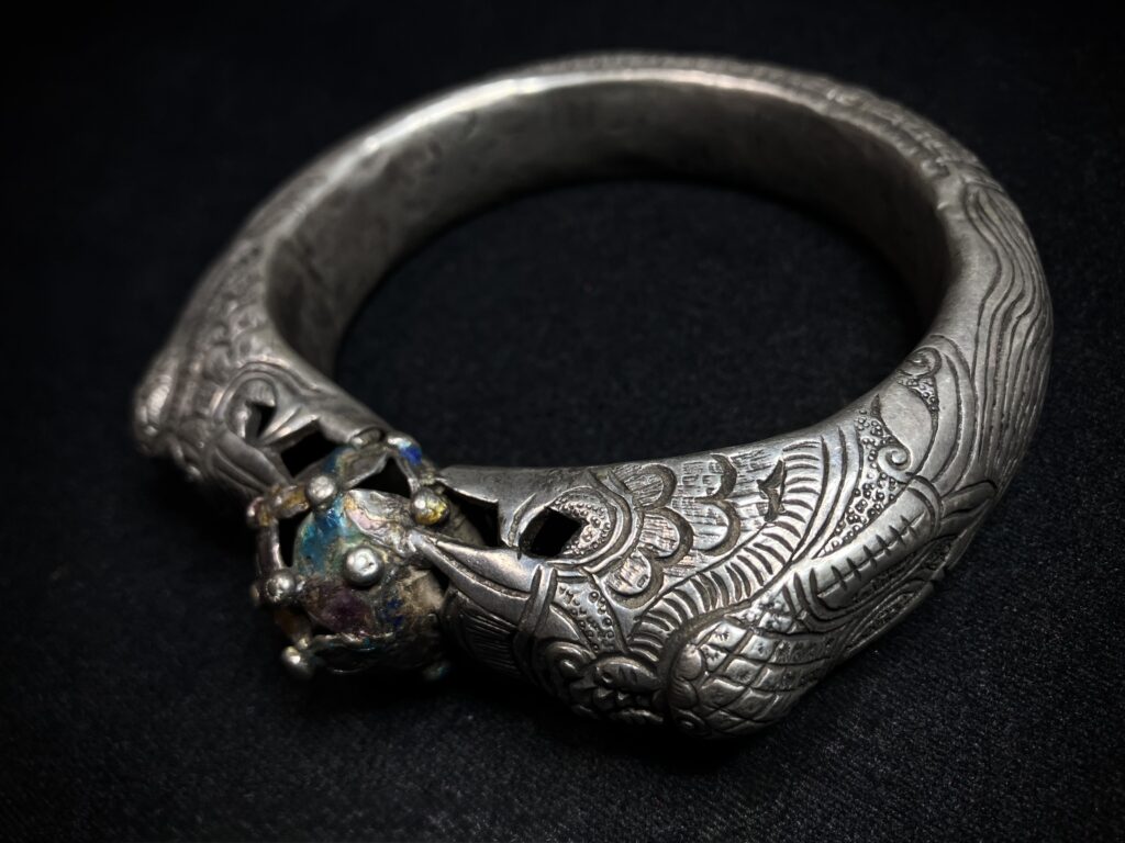 ヤオ族が実際に使用してきたオリジナルのシルバーブレスレット。龍をモチーフとしたシルバーアクセサリーでどこか優しさと品性が感じられる貴重な逸品。