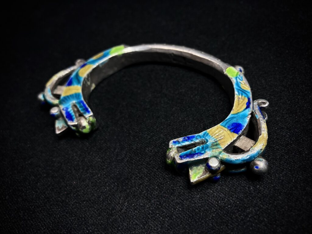 ヤオ族が実際に使用してきたオリジナルのシルバーブレスレット。龍をモチーフとしたシルバーアクセサリーで七宝が残っている貴重な逸品。