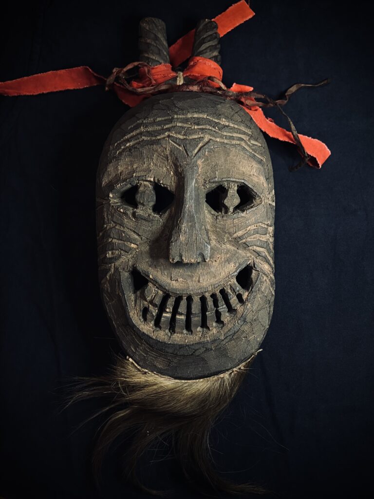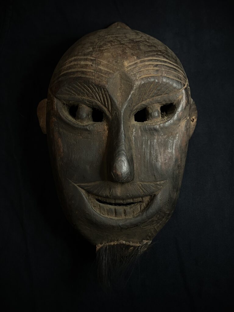 ヤオ族のシャーマンが実際に使用していた木製の儀礼用マスク。こちらはベトナム側に住むヤオ族のもの。毛をあしらった髭がしっかり残っています。荒々しさと柔らかさを感じます。